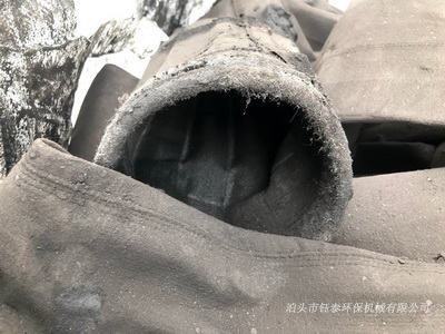 除塵器使用地點:寧夏石嘴山,除塵濾袋使用壽命:3年,除塵濾袋規格:500g滌綸針刺氈,粉塵類型:黑砂,粉塵特性:粗粉塵、濕度大,干燥時會變成固體并粉碎,工作溫度:低于60℃除塵器吸風口處有一個除塵濾袋在袋口損壞,濾布完全成了黑色,由于缺少一個濾袋