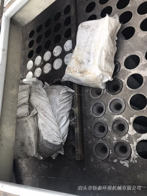 除塵器吸風口處有一個除塵濾袋在袋口損壞,濾布完全成了黑色,由于缺少一個濾袋,造成除塵器出風口周圍的花板上有一堆灰塵。