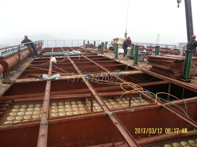 5、噴吹管安裝,嚴格按圖紙進行,保證其與花板間的距離,保證噴管上各噴嘴中心與花板孔中心一致,其偏差小于2cm。