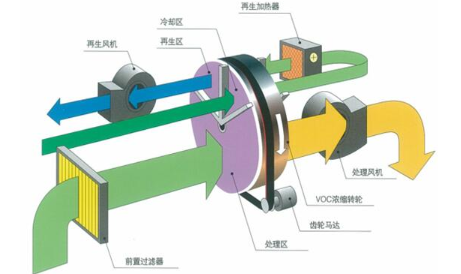 通過轉輪的旋轉,可在轉輪上同時完成氣體的濃縮和沸石的再生。進入濃縮轉輪的有機廢氣在常溫下被轉輪吸附區吸附凈化后直接排放至大氣,接著因轉輪的轉動而進入脫附區,吸附了有機物質的沸石在此區內脫附,吸附在沸石上的有機物被分離、脫附、進入后續處理系統,如此循環工作。