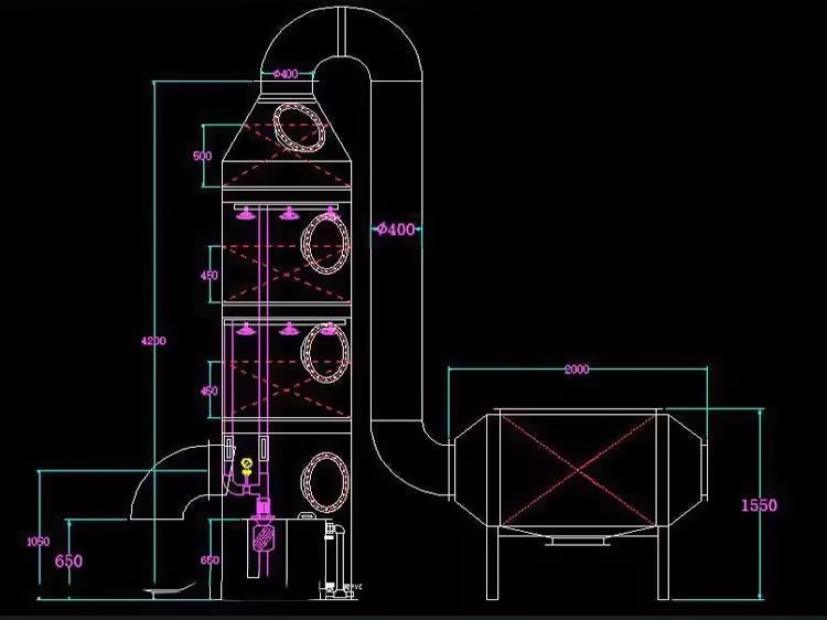 廢氣由風機引入噴淋塔,內(nèi)筒形成壓力室,壓力室均勻分布到每個鼓泡管。廢氣通過鼓泡管,進入液體吸收罐吸收鼓泡液體,然后氣泡通過填料層。氣-液兩相與吸收中和反應完全接觸。水經(jīng)塔底的水泵加壓后噴在塔頂,最后返回塔底回收,并且吸收和過濾后的廢氣繼續(xù)向上流動并被噴射。管子噴出的吸收中和液產(chǎn)生最終反應。中和反應后,末端除霧板脫水除塵后的氣體排入大氣,它也可以與光氧催化或低溫等離子體和活性炭氣體凈化設備結合使用。處理后廢氣達到地方或國家排放標準和排放要求