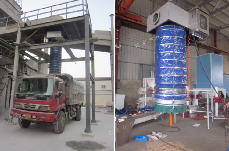 一鍵開啟自動裝車,粉塵無外溢是智能化無塵裝車伸縮溜筒的亮點,為了使無塵裝車伸縮溜筒具有除塵功能,關鍵是在溜筒出口處布置吸塵點。在除塵器離心風機的驅動下,在溜筒出口處的吸塵點