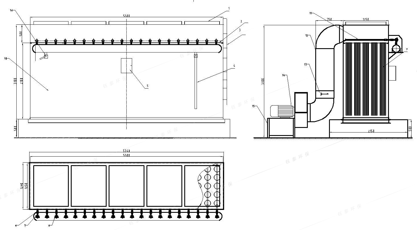 改造后,灰?guī)斓拿繂闻_(tái)庫頂布袋除塵器技術(shù)參數(shù):處理風(fēng)量17000m3/h、過濾風(fēng)速1.0m/min、過濾面積240m2,濾袋耐溫135℃、抽塵風(fēng)機(jī)出口含塵濃度≤10mg/Nm3。除塵器外型尺寸為原除塵器外殼尺寸:5.3×1.25×3.1m(高)