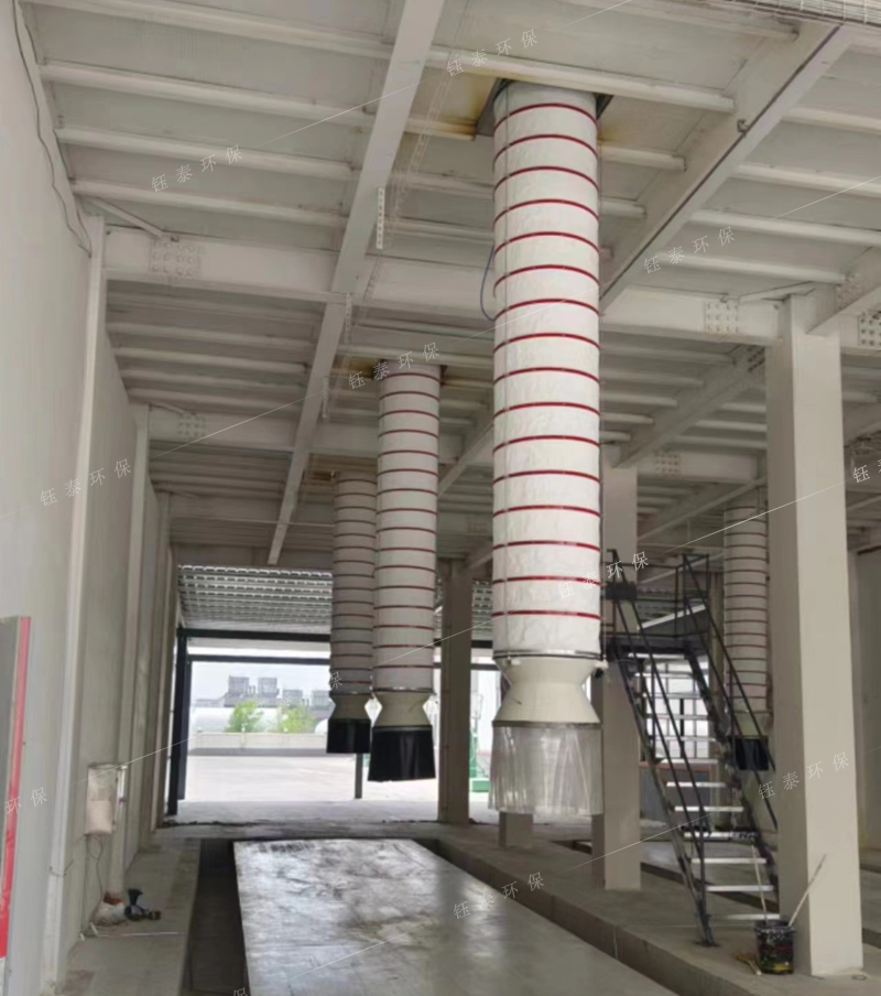 伸縮溜管采用雙層套管結構,由溜筒和防塵罩構成。溜筒內通過物料,防塵罩外套在溜筒上,期間行程吸塵腔。無塵伸縮溜管底部將設料位傳感器和防塵群罩。料位傳感器將設在外側或內側,防塵群罩將采用分塊重疊式。在裝車過程中料位傳感器接觸物料后,無塵伸縮溜管將及時提升使料頂與堆積的物料始終保持一定距離。防塵群罩能罩在料堆上,以保證吸塵效果,防止粉塵外溢。溜筒將采用附有聚氨酯耐磨襯板的鋼板制成,防塵罩采用防靜電柔軟強度大的化纖材料制成。防塵罩內將設置支承骨架,既可上下伸縮,又可保證氣流通暢。伸縮溜管升降自如,無阻滯現象;在伸縮溜管底部將至少設3個吊點,以保證升降機構帶動伸縮溜管平穩升降。